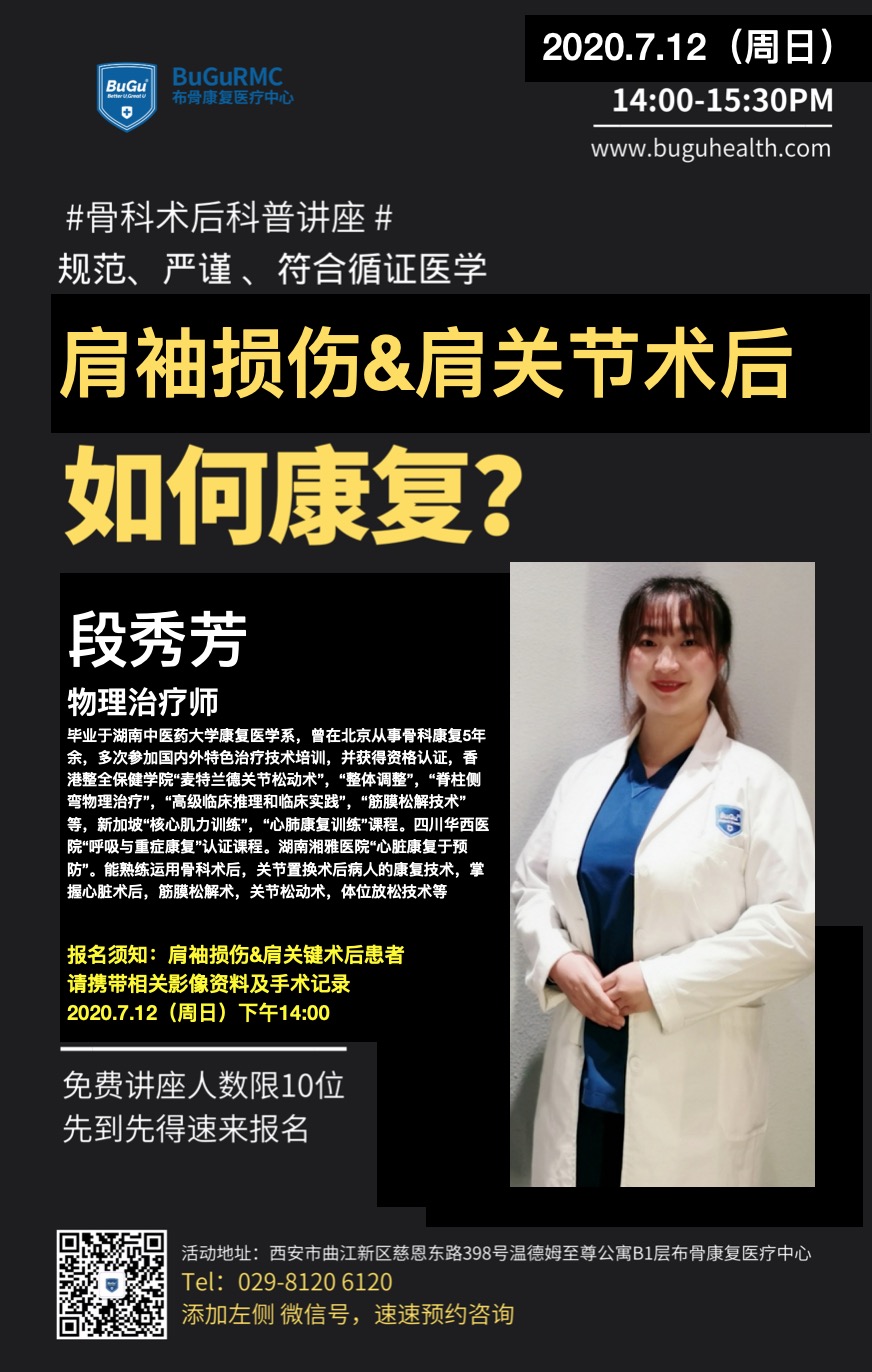 #骨科术后康复系列科普讲座 # 肩袖损伤&肩关节术后如何康复? 报名须知 请携带相关影像资料及手术记录 时间 :2020年8月,每周五下午 13:30 免费讲座人数限5位,享免费康复评估1次 先到先得速来报名 报名方式 Tel:029-8120 6120,添加下方微信号也可.....