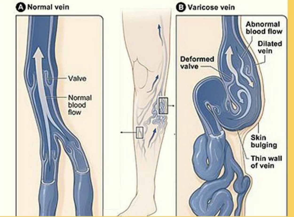 在静脉功能不全的情况下,腿部皮肤下的静脉(称为隐静脉)和较小的连通静脉会扩张。负责将血液输送回心脏的瓣膜因此变得低效,导致血液聚集并扩张静脉,从而导致静脉扭曲。静脉曲张的定义是直径大于3毫米,与静脉曲张或毛细血管扩张症(蜘蛛静脉)相比,后者更细,不太明显。