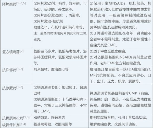 CMP可分为原发性和继发性,继发性CMP根据病因可分为持续性炎症引起的疼痛、结构改变相关的疼痛、神经系统疾病引起的疼痛。针对于慢性肌肉骨骼疼痛用药,你真的了解应该怎样选择才能更有效的帮助缓解症状吗?CMP治疗药有非甾体消炎镇痛药(NSAIDs)、对乙酰氨基酚、肌肉松弛剂、曲马多、阿片类药、复方镇痛药、抗抑郁药、抗惊厥药、抗骨质疏松药、软骨保护剂、外用制剂等等。