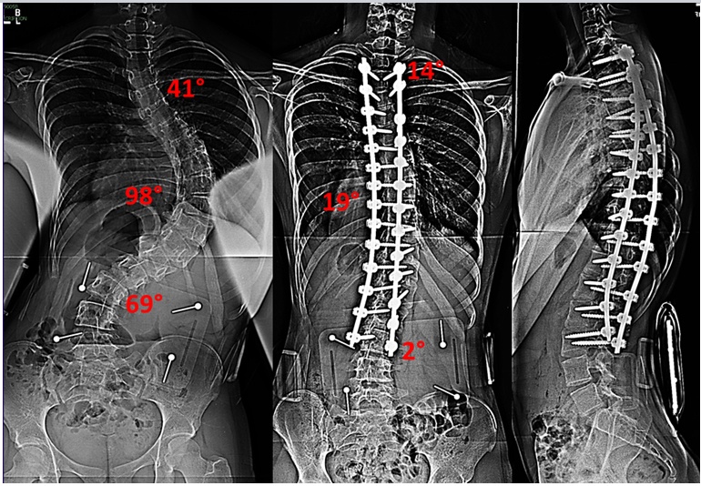 Cobb角大于45°,仍然在进展的脊柱侧弯,或Cobb角大于45°,有并发症的患者。