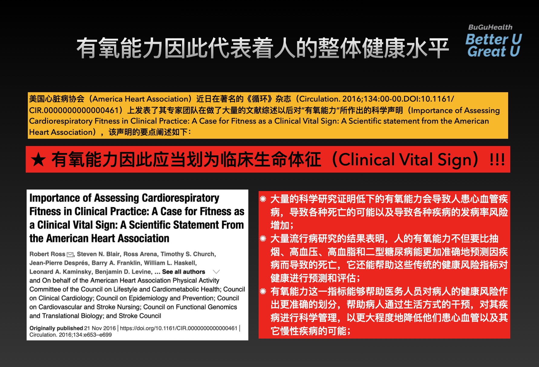 美国心脏病协会(America Heart Association)在著名的《循环》杂志(Circulation. 2016;134:00-00.DOI:10.1161/CIR.0000000000000461)上发表了其专家团队在做了大量的文献综述以后对“有氧能力”所作出的科学声明(Importance of Assessing Cardiorespiratory Fitness in Clinical Practice: A Case for Fitness as a Clinical Vital Sign: A Scientific statement from the American Heart Association)