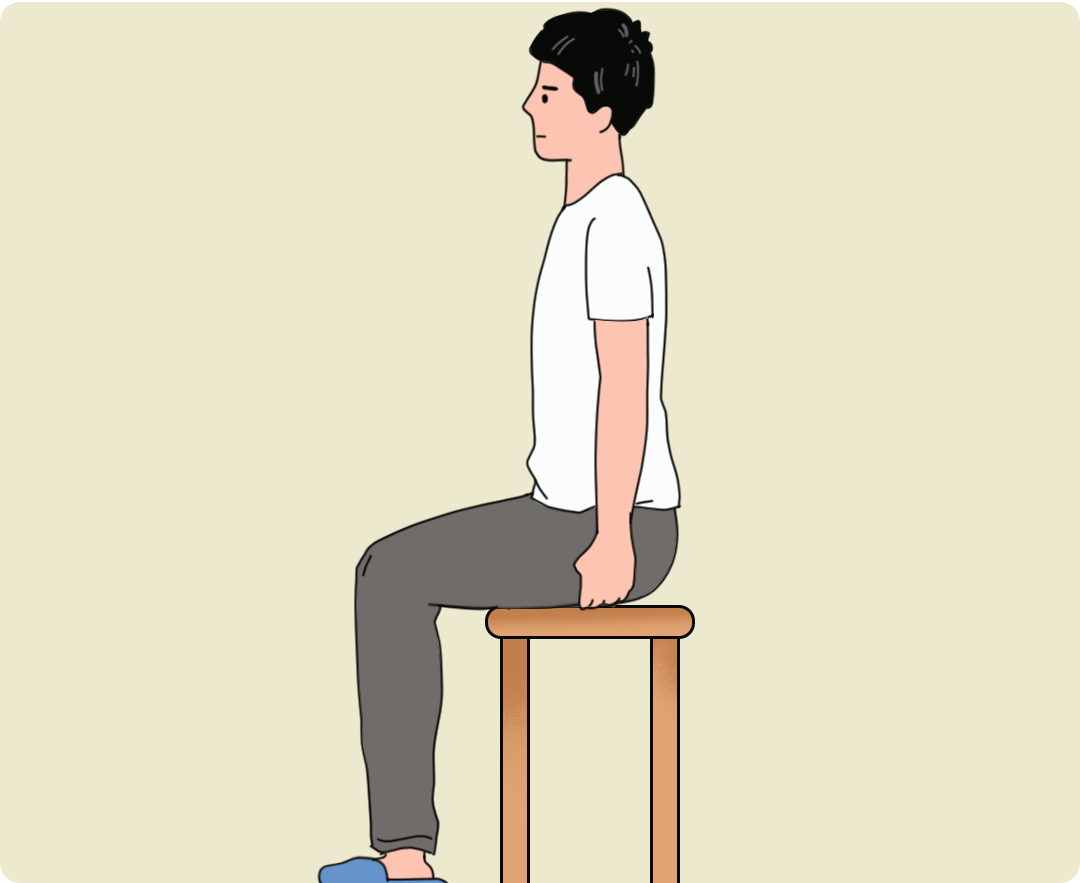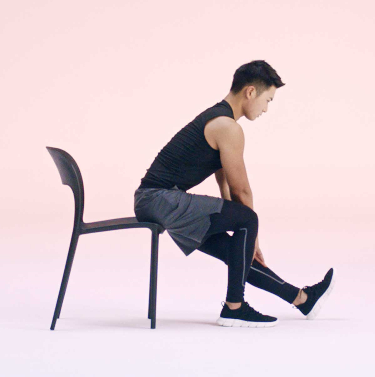 找一把椅子,并坐在椅子的前1/3处。腿伸直,脚尖勾起,背部下压,感受腿部后侧的拉伸,左右双腿交替做