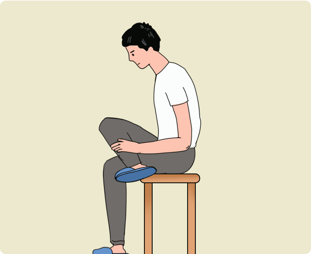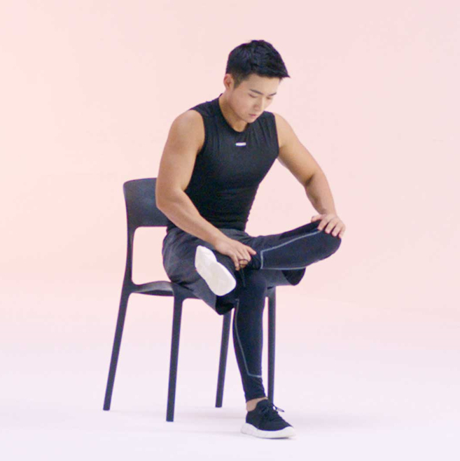 (以拉伸左腿为例)坐在椅子的前1/3处,左腿翘起,放在右腿膝盖上,整个身体向下压,感受臀部拉伸,左右双腿交替做。