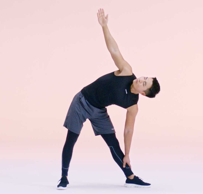 (以拉伸左侧为例)身体全程保持在一个侧面,髋部向右推,头看右手的方向,感受右侧腰和左腿内部的拉伸。
