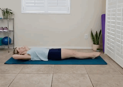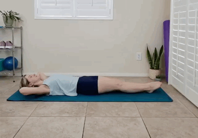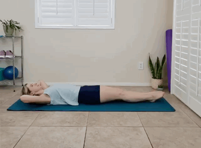 仰卧在瑜伽垫上,双手轻托后脑勺