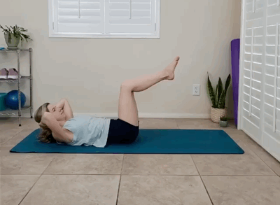 仰卧于瑜伽垫上,双腿屈膝抬起