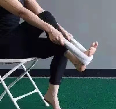 跟键牵拉:双手持毛巾末端并绕过足底, 慢慢牵拉毛巾至极限,膝关节屈曲位,坐位, 膝关节屈曲90度, 双手持毛巾末端并绕过足底, 慢慢牵拉毛巾至小腿后侧有牵张感, 维持5秒钟。