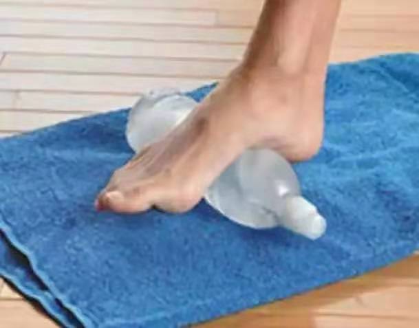 足弓牵拉:坐位, 足置于可乐瓶、高尔夫球或其他相似的物品, 轻中度下压, 由足跟滚至足趾并反复, 每足交替重复。