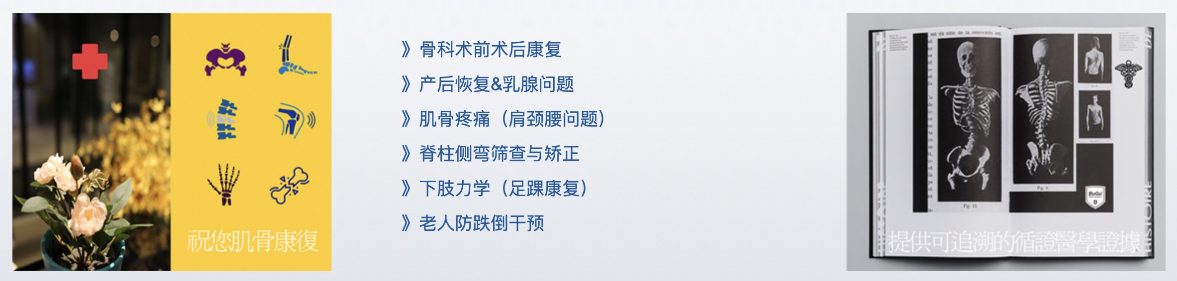 我中心开展骨科、运动医学科、妇产科、康复医学科、中医科,主要治疗项目为物理治疗为:骨科术前术后康复,下肢力学及足踝康复、矫形鞋垫、产后恢复,脊柱侧弯矫正,肌骨疼痛、运动损伤等项目,详情点击。More…