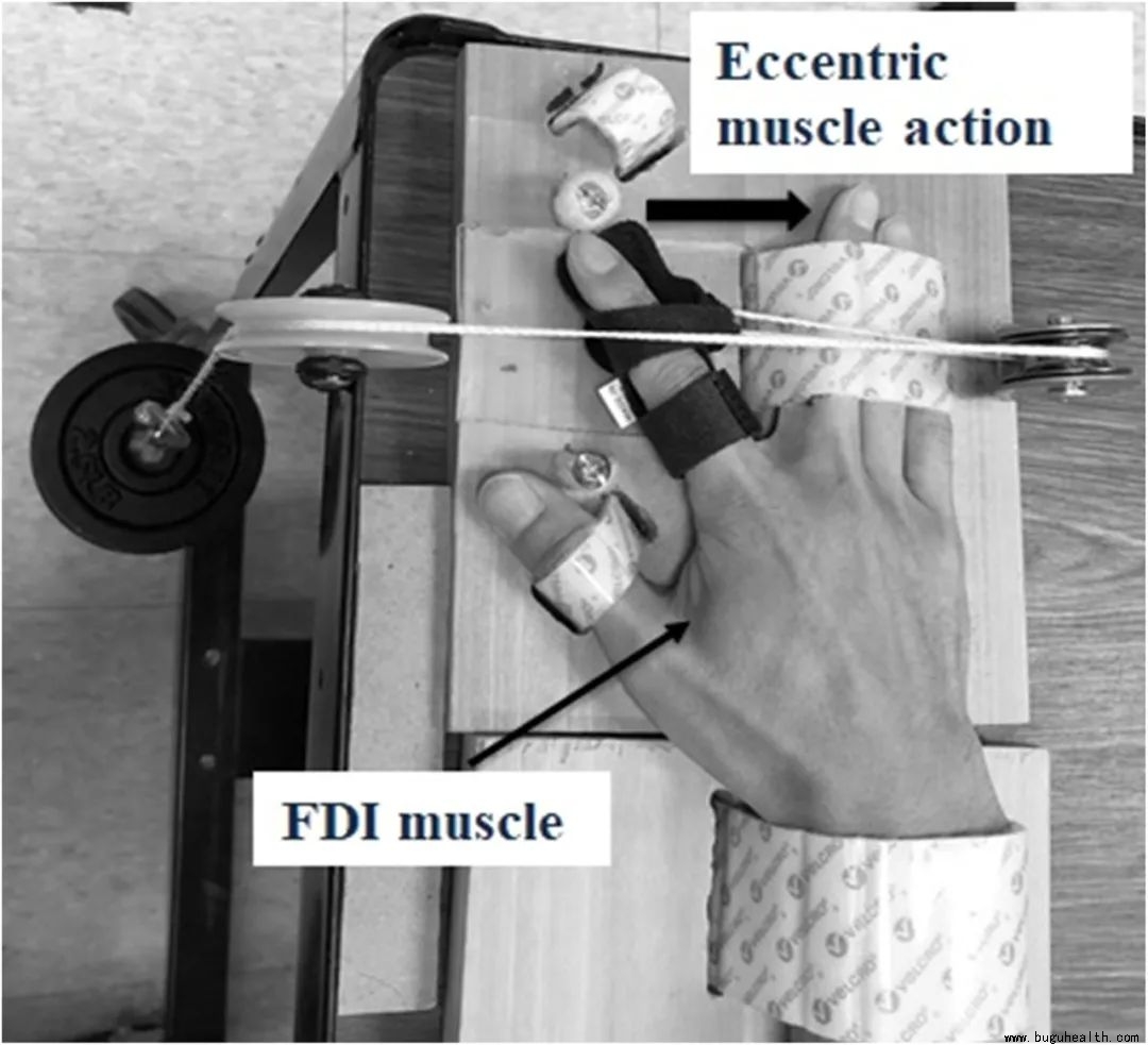 EF组离心收缩使用屈肘(上臂与前臂程90度夹角)等距最大肌力的50%为收缩强度。受试者完成6组每组十次的屈肘离心收缩(手持重物从前臂完全收缩到完全伸直2秒,回到动作起点2秒;在最低处研究人员将重物拿起重新提至起点)。IA组离心收缩主要以受试者食指完成。研究人员将受试者手掌与手指固定在一块木板上,唯有食指可以自由活动。重物通过滑轮连接在食指上,因此,重物下落时,食指会离心收缩靠近中指方向(下图)。稍不同与EF的是IA组以1.5秒/1.5秒的运动速度收缩/放松(因为手指活动范围相对上臂关节较小)。EF和IA组与组休息时间都为两分钟。