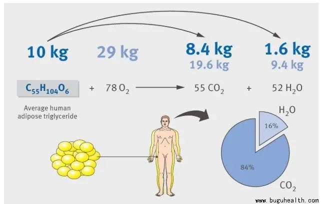因此,人体会通过排出二氧化碳和水来消耗脂肪,即通过呼吸从肺部呼出二氧化碳,以及通过汗液、呼吸、粪便、尿液和其他体液排出水[1]。