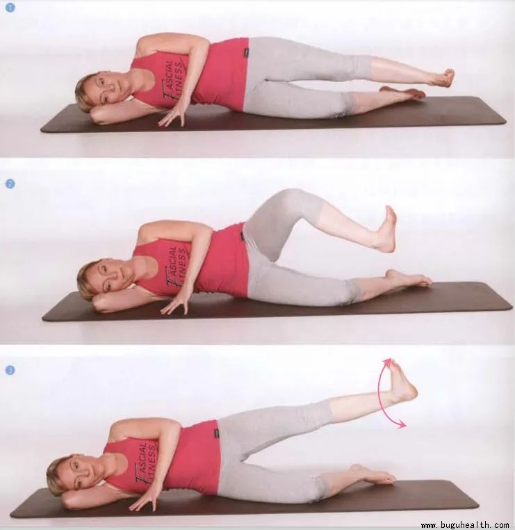 1.侧卧位,以左腿为例,右腿稍微屈曲,左腿稍微抬高悬空,腹部核心收紧。
