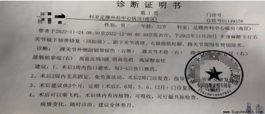 张先生:32岁,于2022年9月10日运动时不慎扭伤脚腕,当时去医院拍x线检查无骨折,后在家静养一段时间,症状无好转趋势:一个月后,去医院检查核磁报告显示,距腓前韧带断裂,骨髓内水肿严重,并于11.29日进行韧带修复手术。