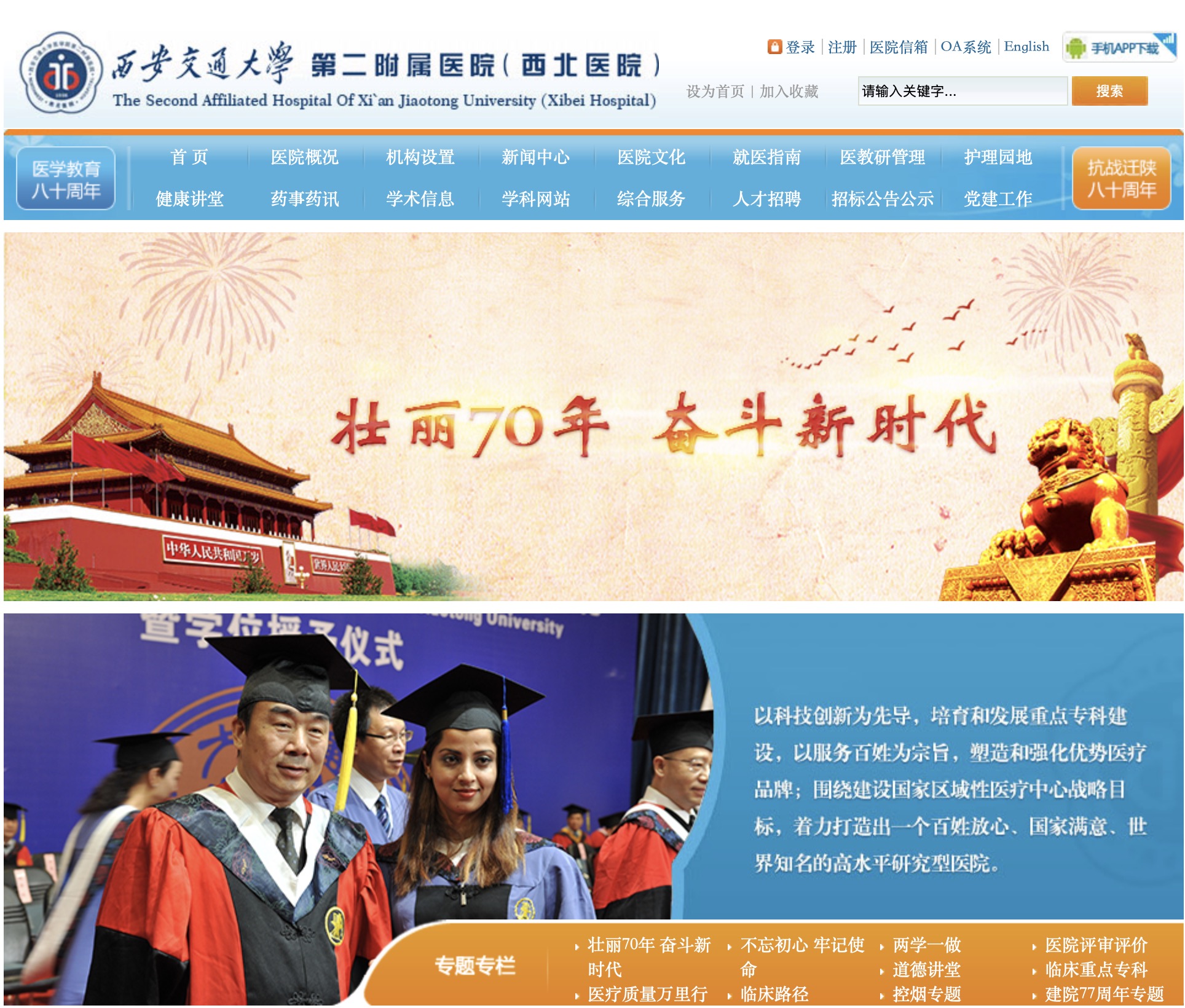 西安交通大学第二附属医院是国家卫生健康委员会、教育部直属的一所集医疗、教学、科研、预防保健为一体的现代化大型综合医院,国家首批三级甲等医院。医院源起1912年由国家教育部创办的中国第一所国立医学院校——国立北京医学专门学校、国立北平大学医学院附属医院,是中国第一所国立大学附属医院。自1937年在抗战烽火中为民族大义迁陕重建,81年来,兴医强国,艰苦奋斗,精勤育人,救死扶伤,为西北医学高等教育和现代医学科学的创立、发展做出了卓越贡献。