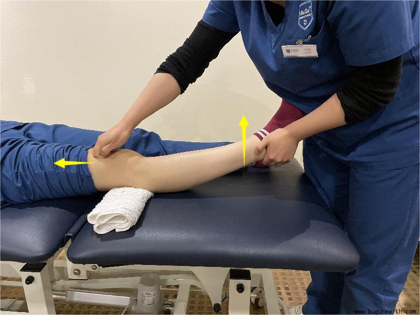 第二:辅助膝关节主动运动,一手在小腿远端,另一手在髌上囊,辅助主动伸膝。同时我们也可以徒手上提髌上囊处、股四头肌处并移动。目的是扩大股四头肌和骨的间隙。