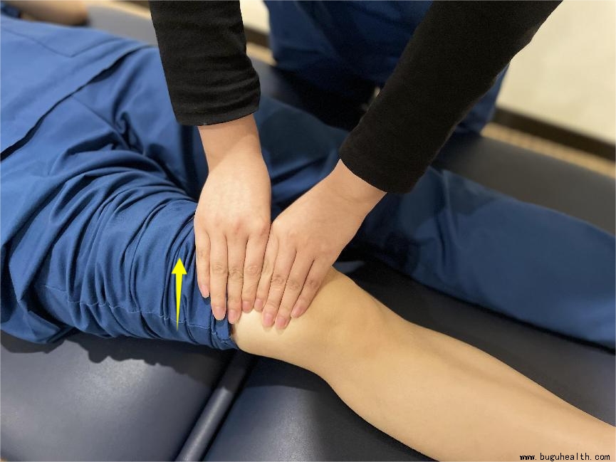 如果有髌上囊粘连的发生,需要诱发股中间肌与膝关节肌的收缩使得髌上囊上提,操作方法如下: