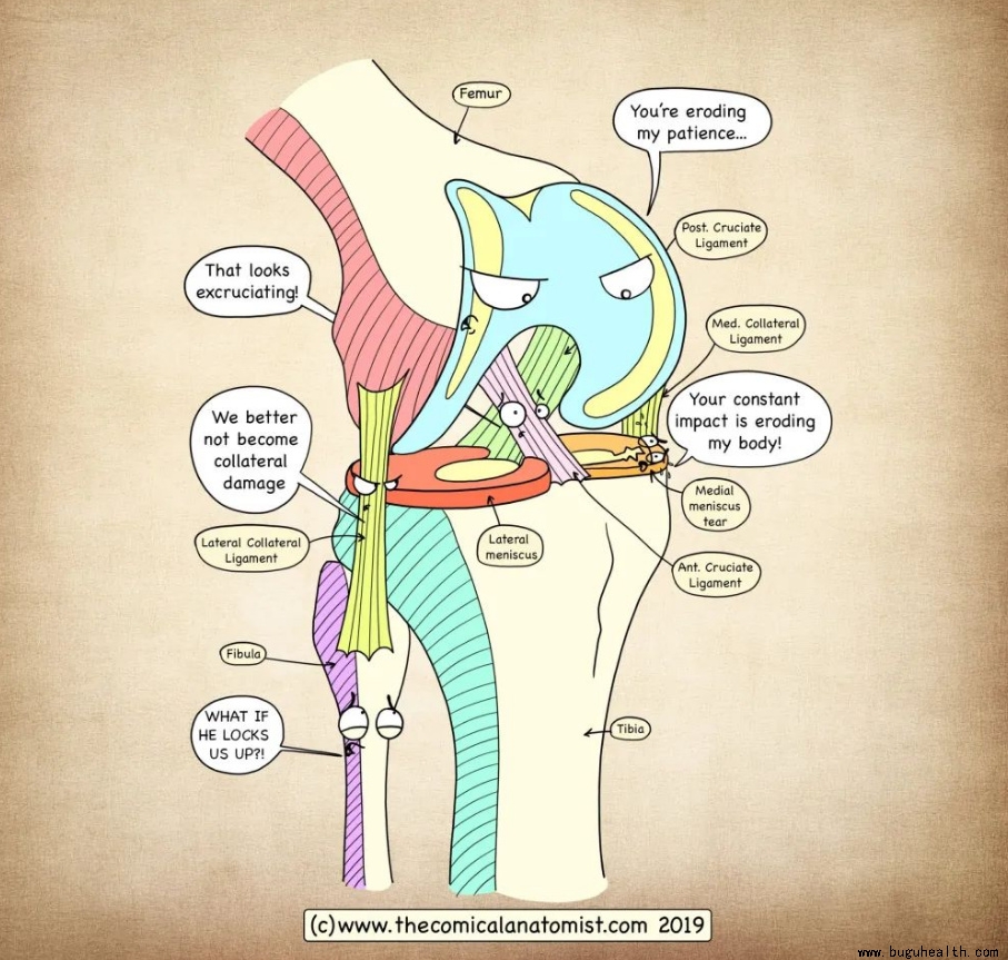 膝关节完全伸直时,内、外侧副韧带紧张,关节稳定,不易伤及半月板。但胫股关节的最大轴向作用力为2.3-7.1倍体质量,髌骨关节的受力在正常步态下为0.2-1.8倍体质量,若是在跑步或跳跃时可增大至约11倍体质量。也即人在跑步或做跳跃动作乃至做突然发力伸直膝关节时,它的受力会大大超过膝关节本身可承受的生理范围,也就造成了其极易受损。