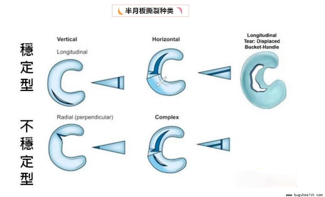 半月板撕裂后进行手术的病人,在进行术后康复运动之前,最重要的就是先分辨是属于哪种半月板撕裂,撕裂的大小,半月板修补时组织的强韧度如何,才可以推估康复所需要的时间长短。一般来说,可以分成:稳定型:vertical longitudinal tear,horizontal tear,bucket handle tear