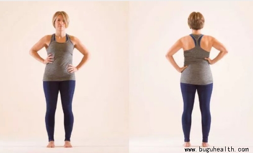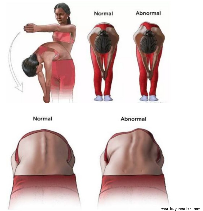 如图所示,站立双手前平举合掌,身体自然放松的向前向下,这个时候背部脊柱的状态就会呈现出来,是否有脊柱侧弯的问题,一目了然。