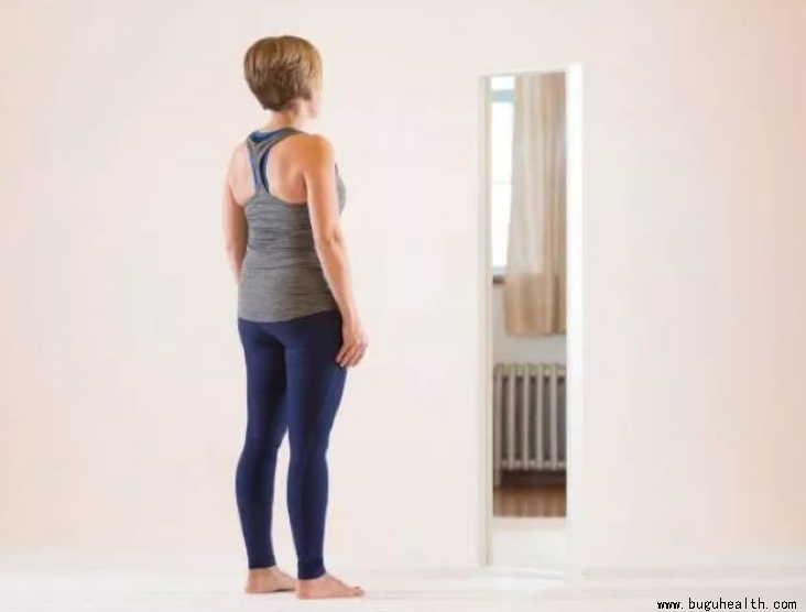 从头顶伸展脊柱,肩膀和镜子的头部对齐