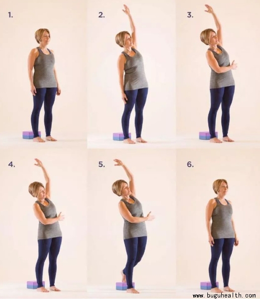身体后侧放一块砖,抬起左臂向右侧弯,保持2个呼吸