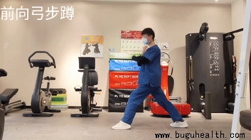 站立位时,左脚往前迈一大步成弓步下蹲,身体向下压,右腿维持不动。坚持几秒后换右腿,动作不变。