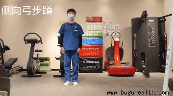 站立位时,右脚往身体右侧跨一大步,弓步下蹲的同时身体往下压,身体可以倾斜。坚持几秒后换到对侧腿。