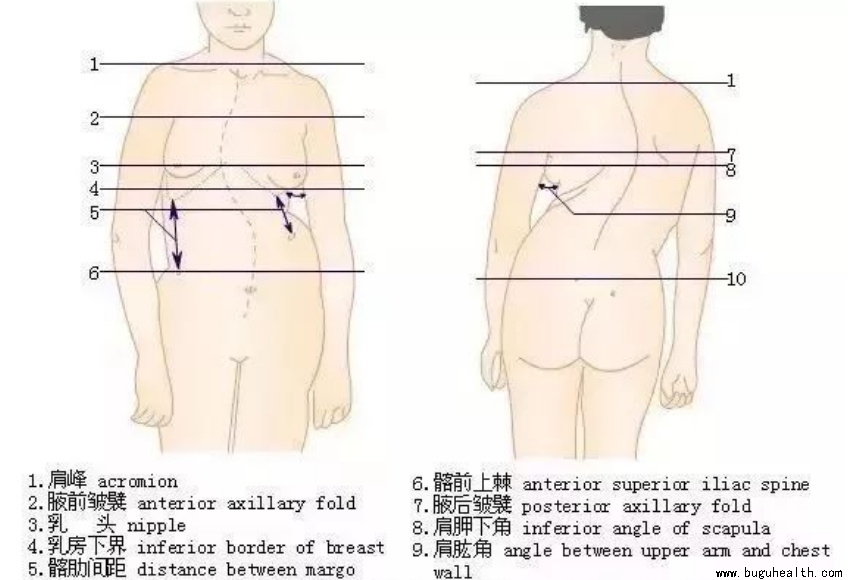 ⑤腋前皱壁的最高点、乳头、乳房下缘等抬高,胸廓丰满。