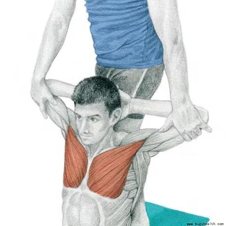 动作要领:练习者坐在瑜伽垫或长凳上,将双手放在头后,使肘部与头部平齐。辅助练习的同伴站在练习者身后,将练习者的手臂向后上方牵拉,同时用腿抵住练习者的背部。