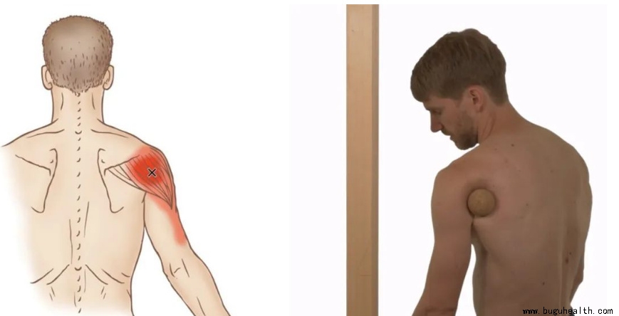 三角肌后束激痛点可以引发肩部后方疼痛。在三角肌后束上寻找压痛点,找到之后,用按摩球抵住墙壁,逐渐施力按压。