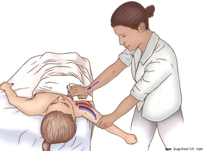 患者仰卧在按摩床,治疗师站于患侧,一只手固定其躯干和肩胛带,另一只手抓住其上臂,使患者肩关节处于外展、外旋姿势。
