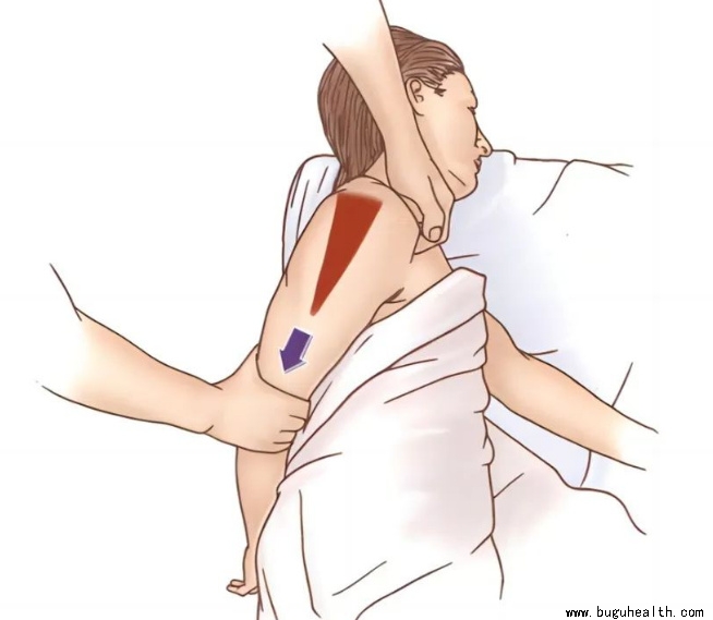 患者侧卧在按摩床,治疗师站于患者身后,一只手固定患者肩胛带,另一只手抓住患者肘部上端,并使其屈曲置于身后。将客户手臂向下移动至阻力点。当治疗师继续下拉时,嘱患者进行对抗,保持10秒,然后放松几秒,继续重复“拉伸—对抗—放松”的操作,重复完成3次。