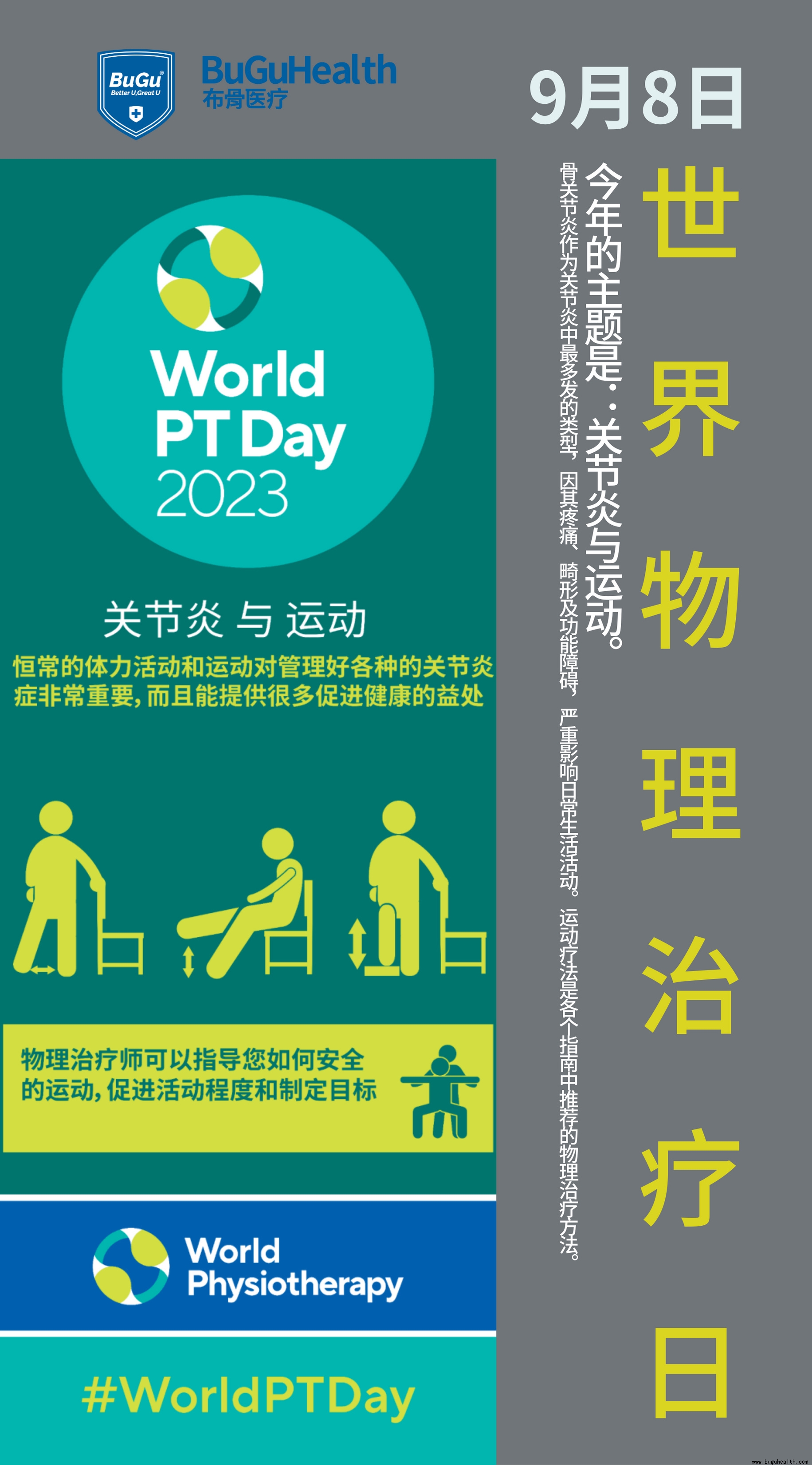 今年世界物理治疗师日的主题依旧是关节炎,延续了去年的骨关节炎,今年深入研究了某些炎症性关节炎,包括类风湿性关节炎、中轴性脊柱炎、幼年特发性关节炎等,以及物理治疗师在治疗和管理受关节炎影响人群中的作用。
