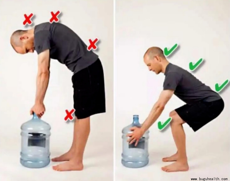 通过弯曲膝盖和蹲下正确举起东西,确保背部挺直。