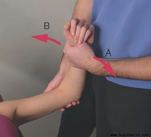 患者仰卧在按摩床边缘,治疗师一只手固定客户肩部,另一只手握住小臂。控制患侧肩关节在可活动范围内进行伸展。
