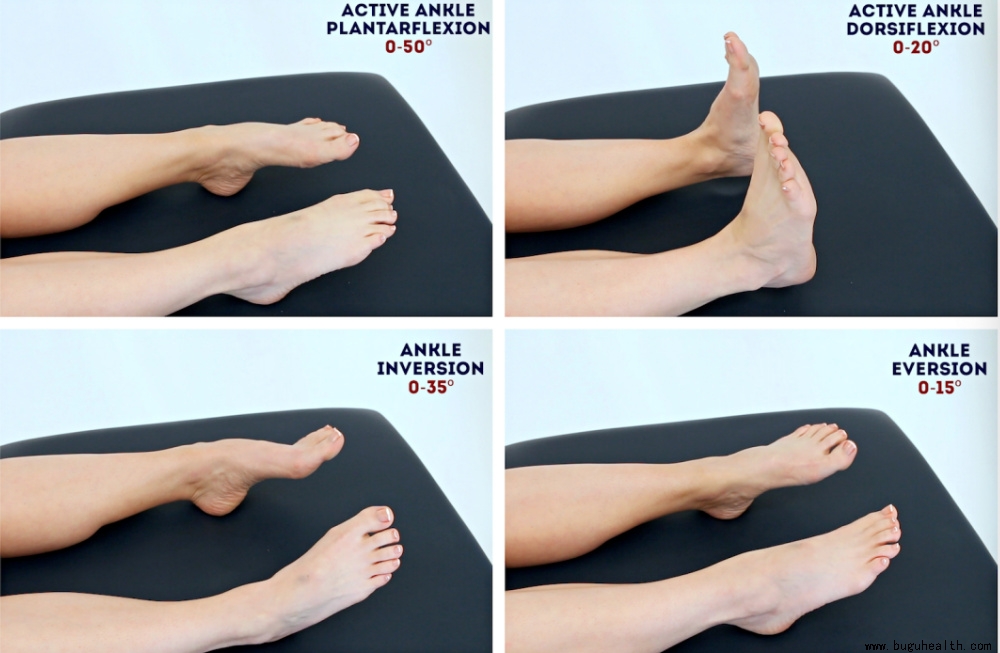 在跖屈、背屈、内翻、外翻、足趾屈、足趾伸6个方向上进行踝关节活动度的训练。