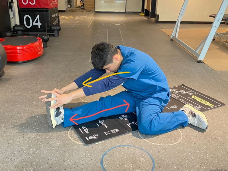 大腿前侧拉伸完了,我们也不要忘了大腿后侧。用图示跨栏步的姿势坐在地上,然后将身体沿着图示黄色标识压向需要拉伸的腿,然后感受红色标识的大腿后侧,也就是腘绳肌的拉伸感,拉伸30秒,然后交替进行。