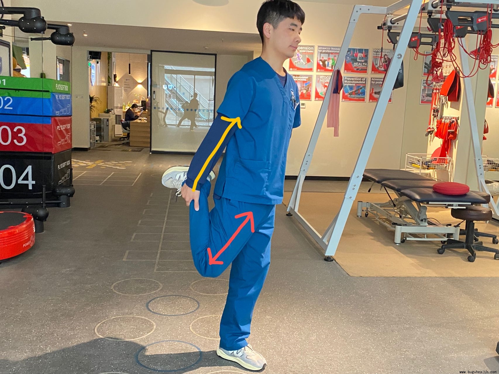 也可以试试站着拉伸,采用图示的姿势,用单腿站立,如果站不稳的朋友可以手扶着墙面。同样用同侧的手抓住脚踝,然后沿着黄色标识发力,然后感受红色标识,股四头肌的拉伸感,保持30秒,交替进行。