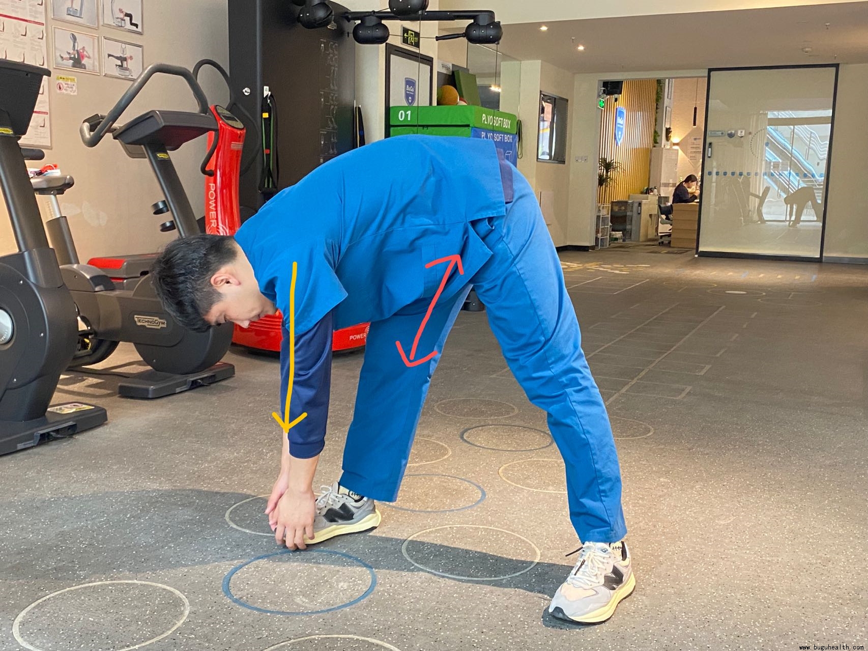 站着该怎么拉伸大腿后侧呢?我们先将两腿打开跨立,然后用身体压向一侧的腿,用手去摸脚尖,然后感受红色标识大腿后侧的拉伸,同样保持30秒,然后交替进行。