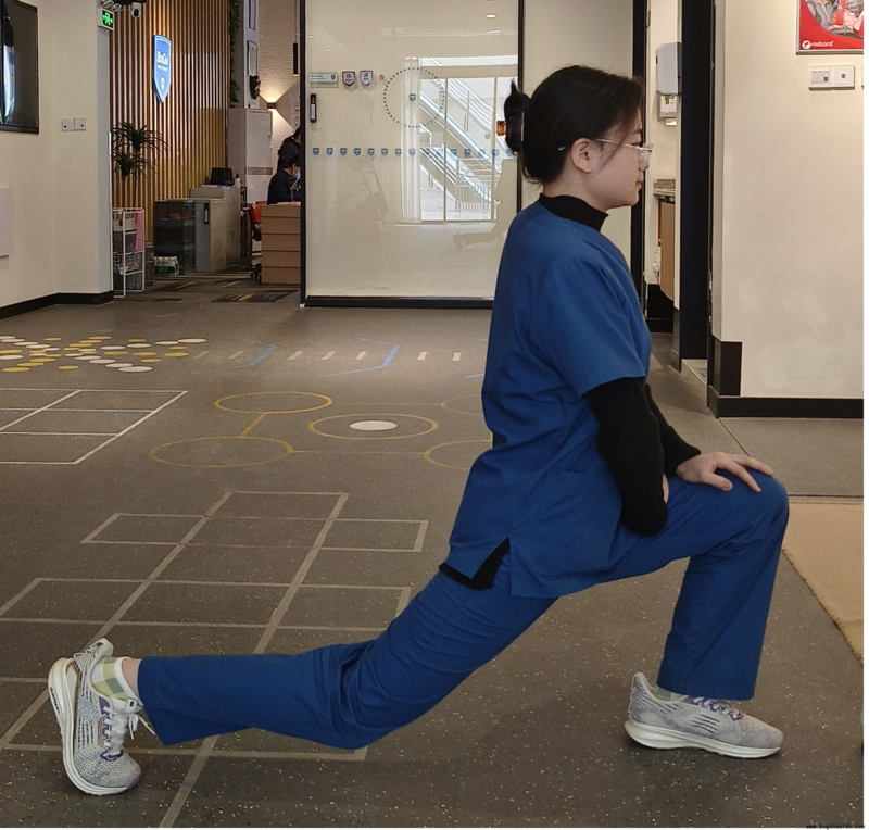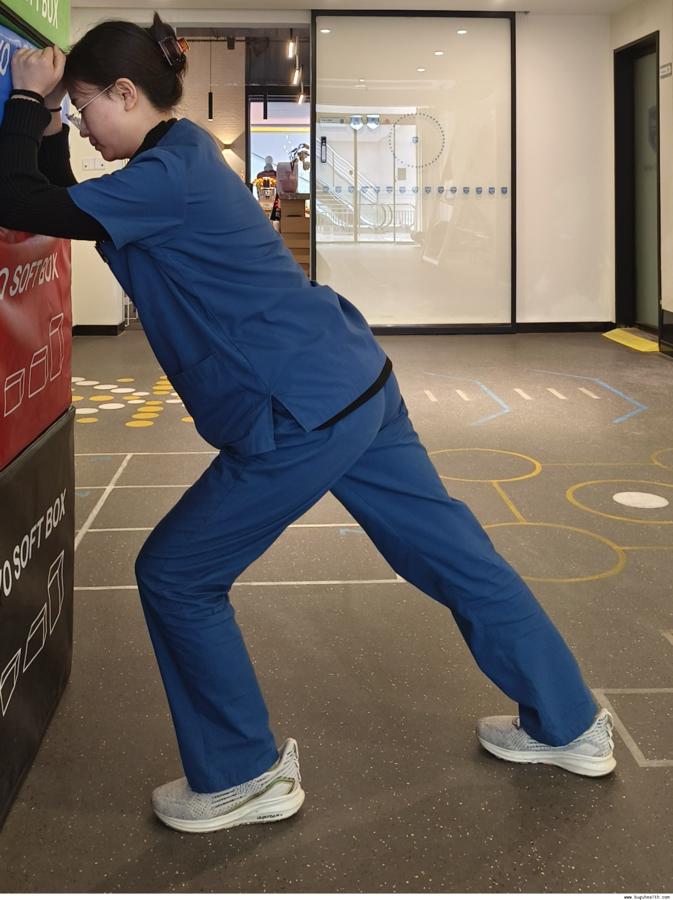 6.拉伸小腿肌:被拉伸侧至于后侧,膝关节伸直,身体向前移,感受小腿的拉伸感。