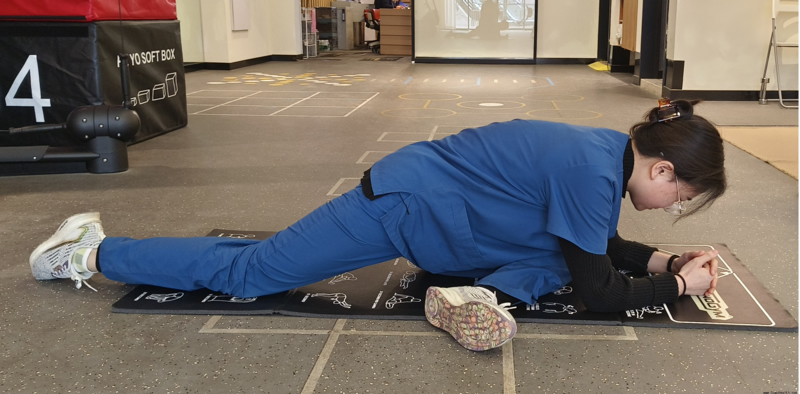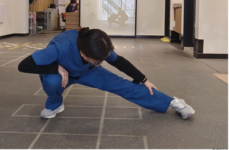 5.拉伸大腿内收肌:脚尖朝向前方,可以根据自己内侧的拉伸强度,主动去摸被拉伸侧的脚尖。