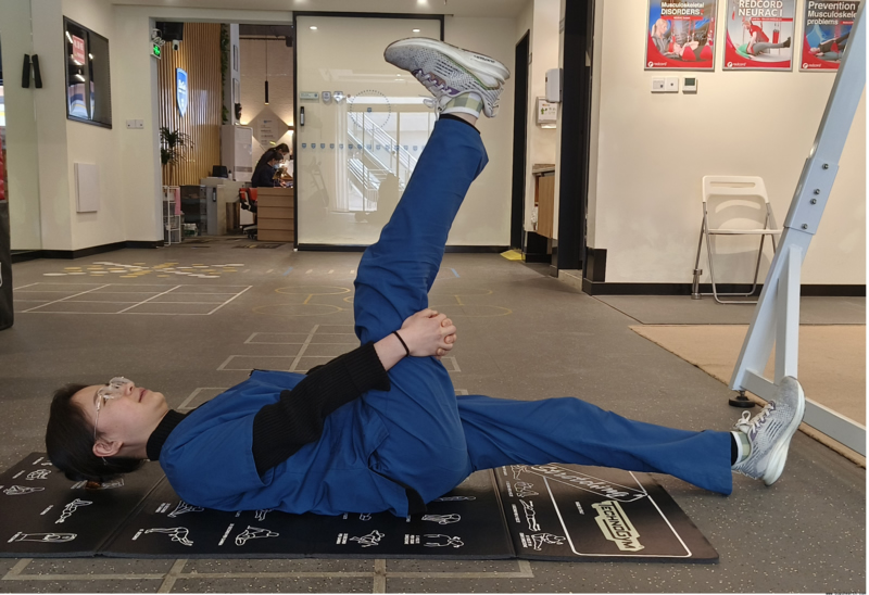 2.拉伸股四头肌:图中拉伸右侧股四头肌,拉伸时注意双侧大腿平行并且不发生髋外展,不出现身体的向前倾斜,以及不挺腰,感受大腿前方的拉伸感;