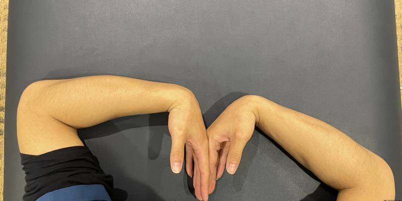 腕关节的自我评估:两手掌相对进行腕关节背伸活动度的评估