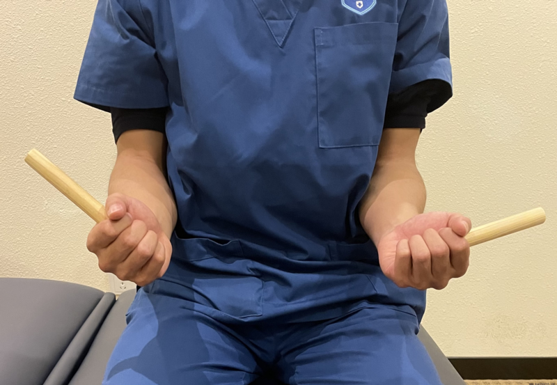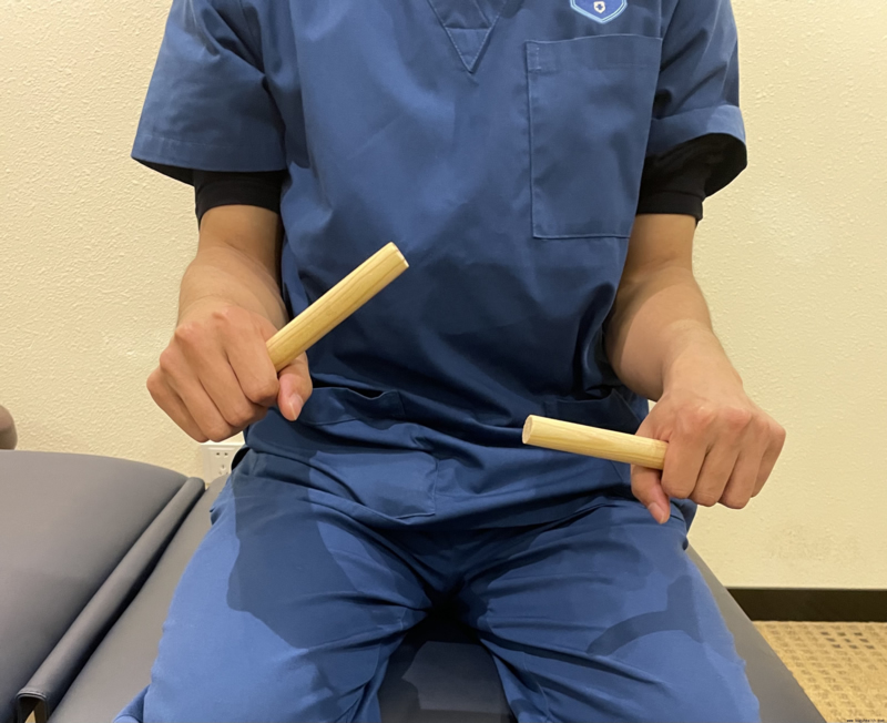 两手各抓握一只笔,两肘紧贴身体,从从竖直位下开始,进行旋前旋后的评估,察是否存在关节僵硬。