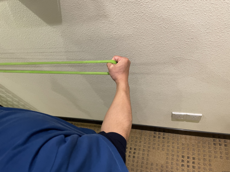 由于腕关节的疼痛,从而采取制动措施,我们要注意的是避免在制动期间出现肌肉的萎缩,导致腕关节功能的下降。为避免在活动时出现疼痛,我们可以固定弹力带一端,用力拉长另一端并保持,且在训练过程中不发生关节活动,可有效避免训练活动产生疼痛和再次损伤。