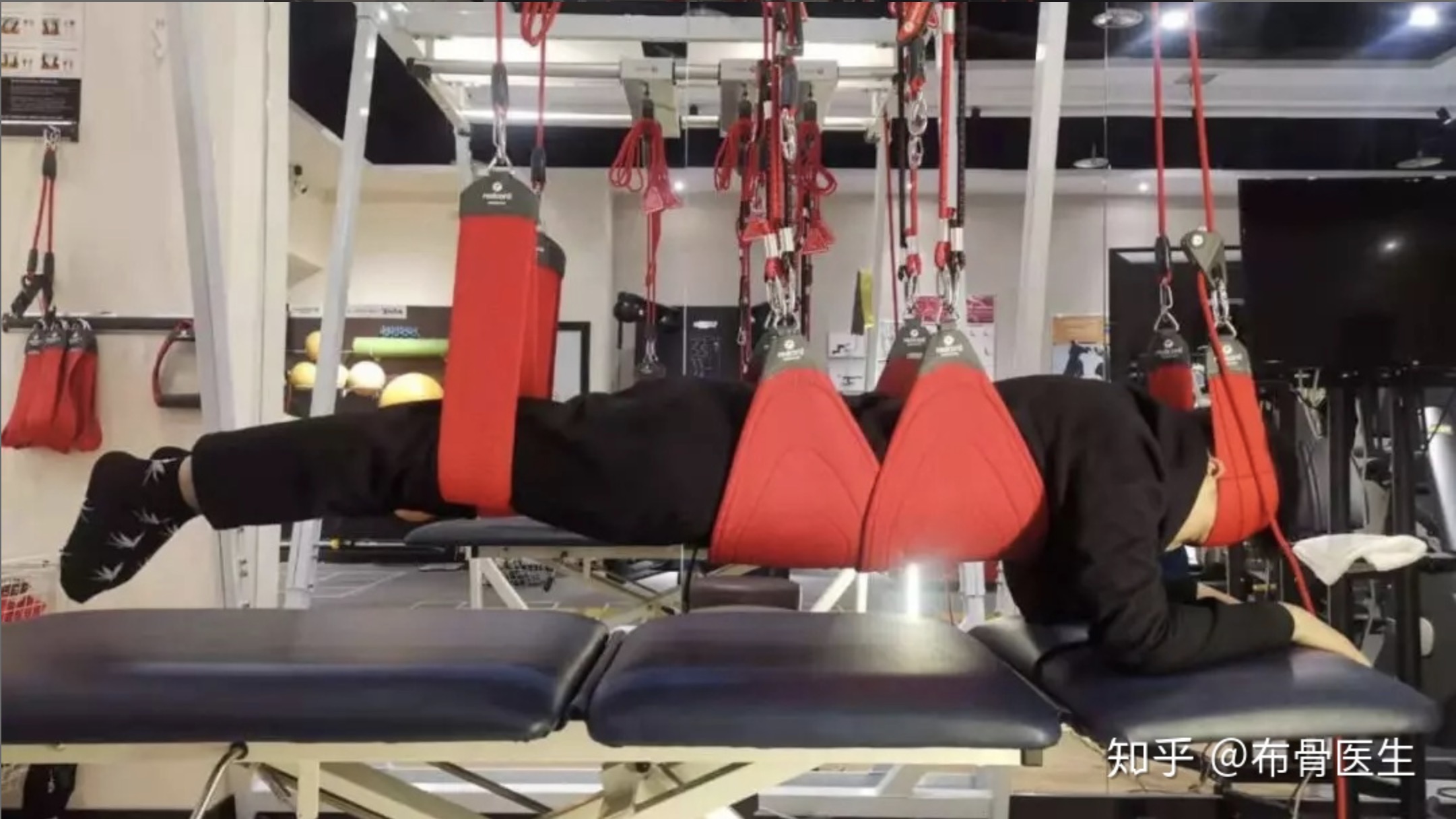 对于存在腰椎不稳定和疼痛还没有彻底缓解的人群在做这些运动时,很有可能加重症状,引起更强烈的不适。造成腰痛的原因是因为负责稳定腰椎的肌群的运动控制出现异常,而非单纯的肌力和耐力异常,所以仅仅只做上边的这些运动是远远不够的。下面我们就来看看redcord是如何在无痛情况下强化腰椎稳定,增强腰腹力量,提高运动控制的: