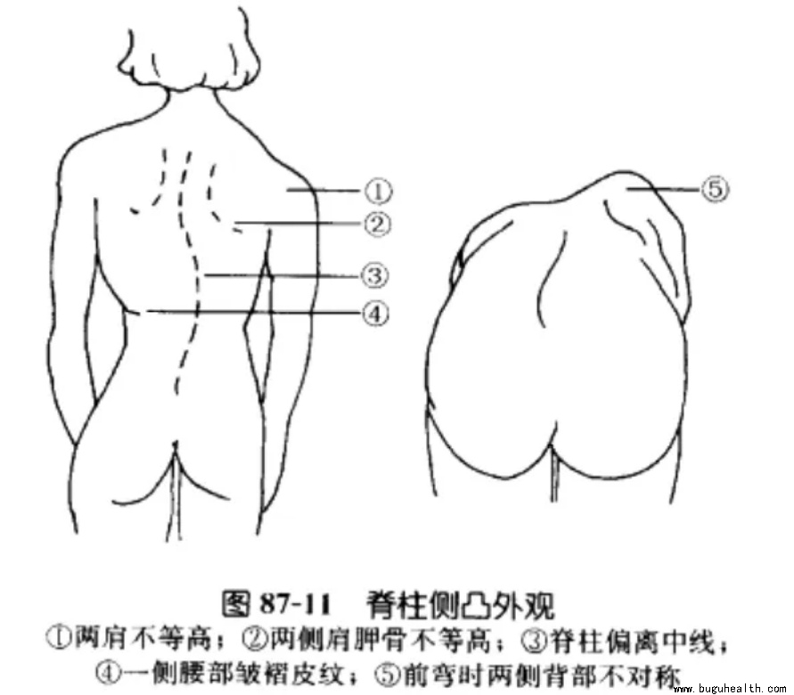 脊柱侧弯具有很多特征性的改变,如双肩不等高;上肢不等长;两侧肩胛骨一高一低,脊柱偏离正中位置,一侧腰部皱褶皮纹;前弯时两侧背部不对称。只要出现上述典型的表现,就要高度怀疑脊柱侧弯发生的可能。