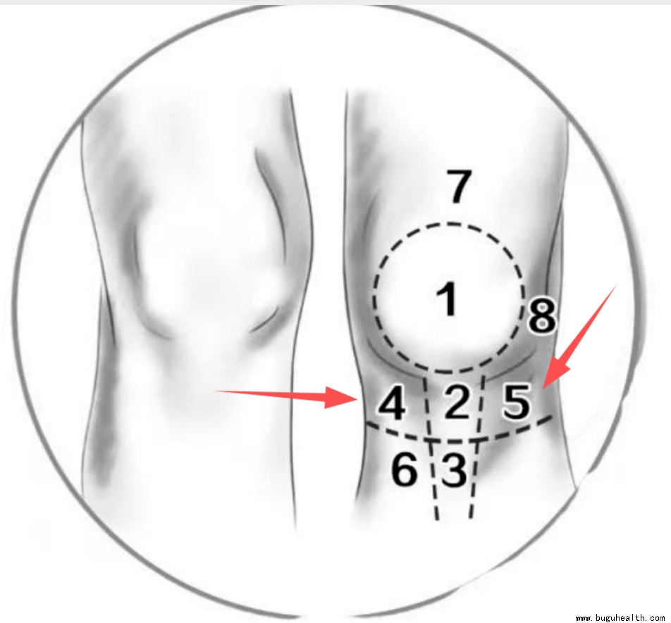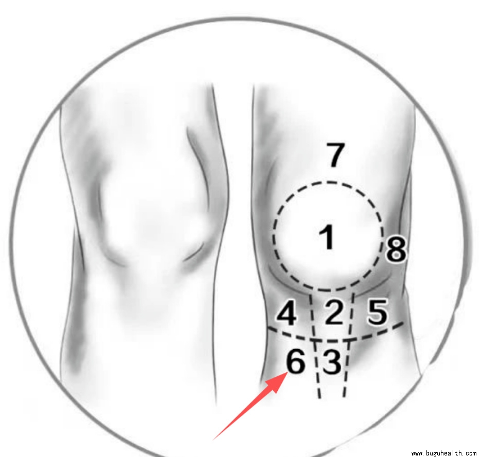 由于位置靠近半月板,6区疼痛也可能被误认为是半月板损伤,但更有可能是鹅足问题。长期运动或组织退变会导致鹅足肌腱和滑囊出现无菌性炎症,引发疼痛。通常表现为局部明显的针刺样压痛。患者常有长时间的屈伸运动史,例如长跑、骑自行车等。