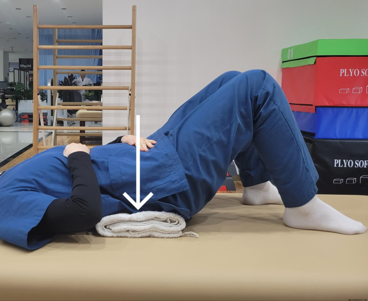 我们通过腰下垫毛巾引导腹部进行收缩训练,通过收腹而不是腰部、腿部发力将毛巾压扁,注意在腰部没有疼痛的情况下进行。每天进行2-3组,每组10-15次。