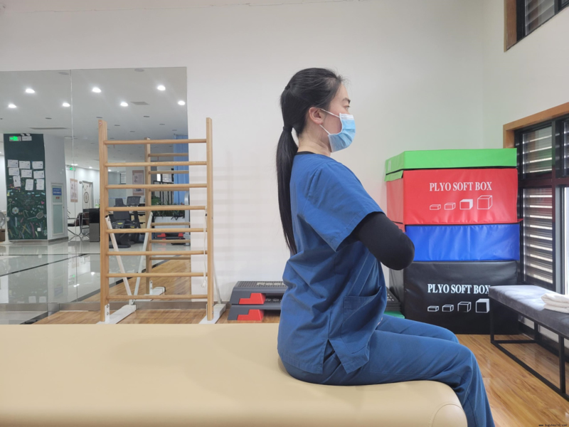 我们来为大家介绍腰部的活动度训练,在坐位将腰椎整体缓慢向后弓、再缓慢向前凹,注意在无痛的范围内活动。每天进行2-3组,每组10-15次。